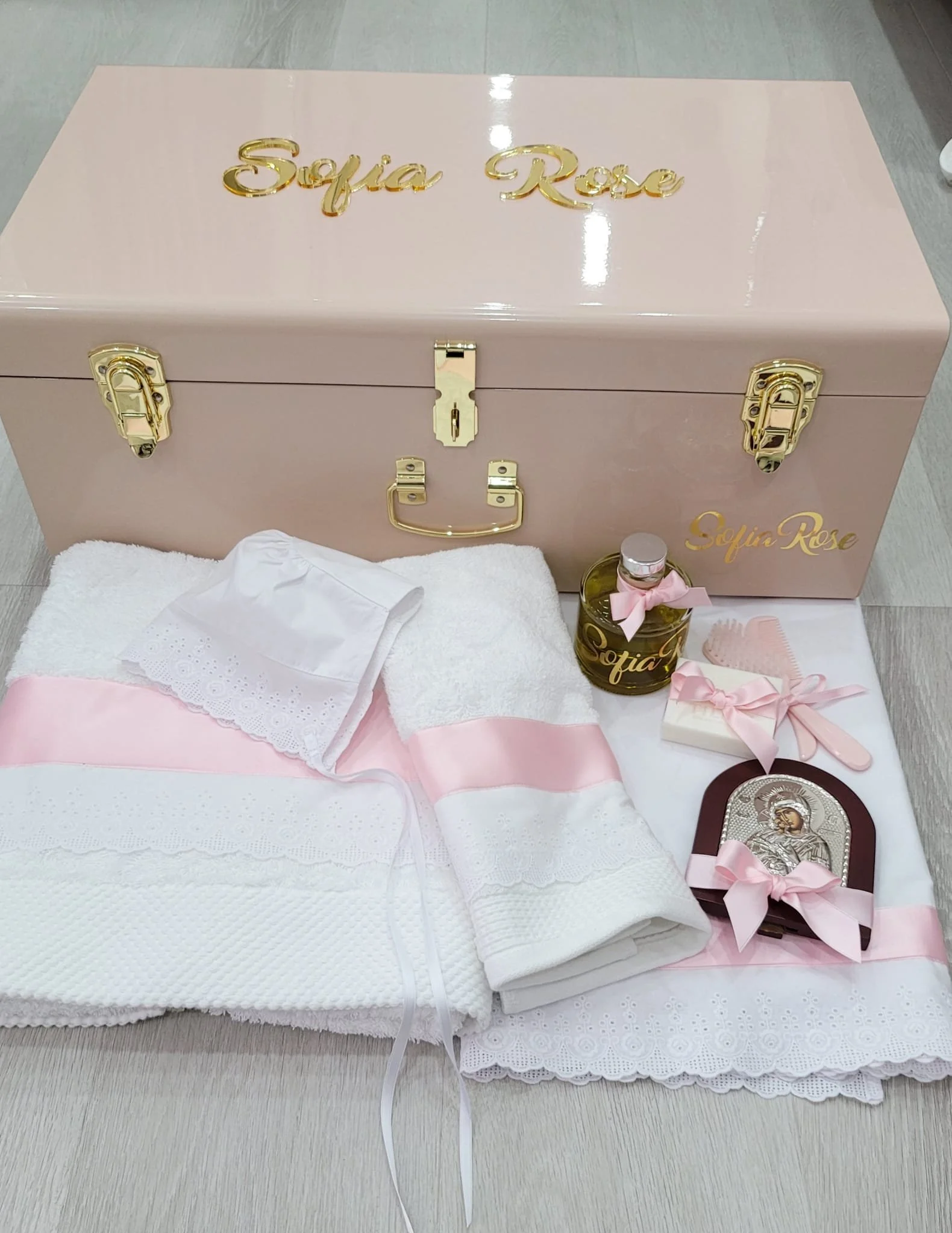 The Receiving Sheet Is 150cm Long also Trim with Cotton Voile Lace trim on Both Ends of the Receiving Sheet. Cotton Oil Receiving Bonnet and Oil Bottle to Match. Personalised name On Towel is Optional , Extra Cost .